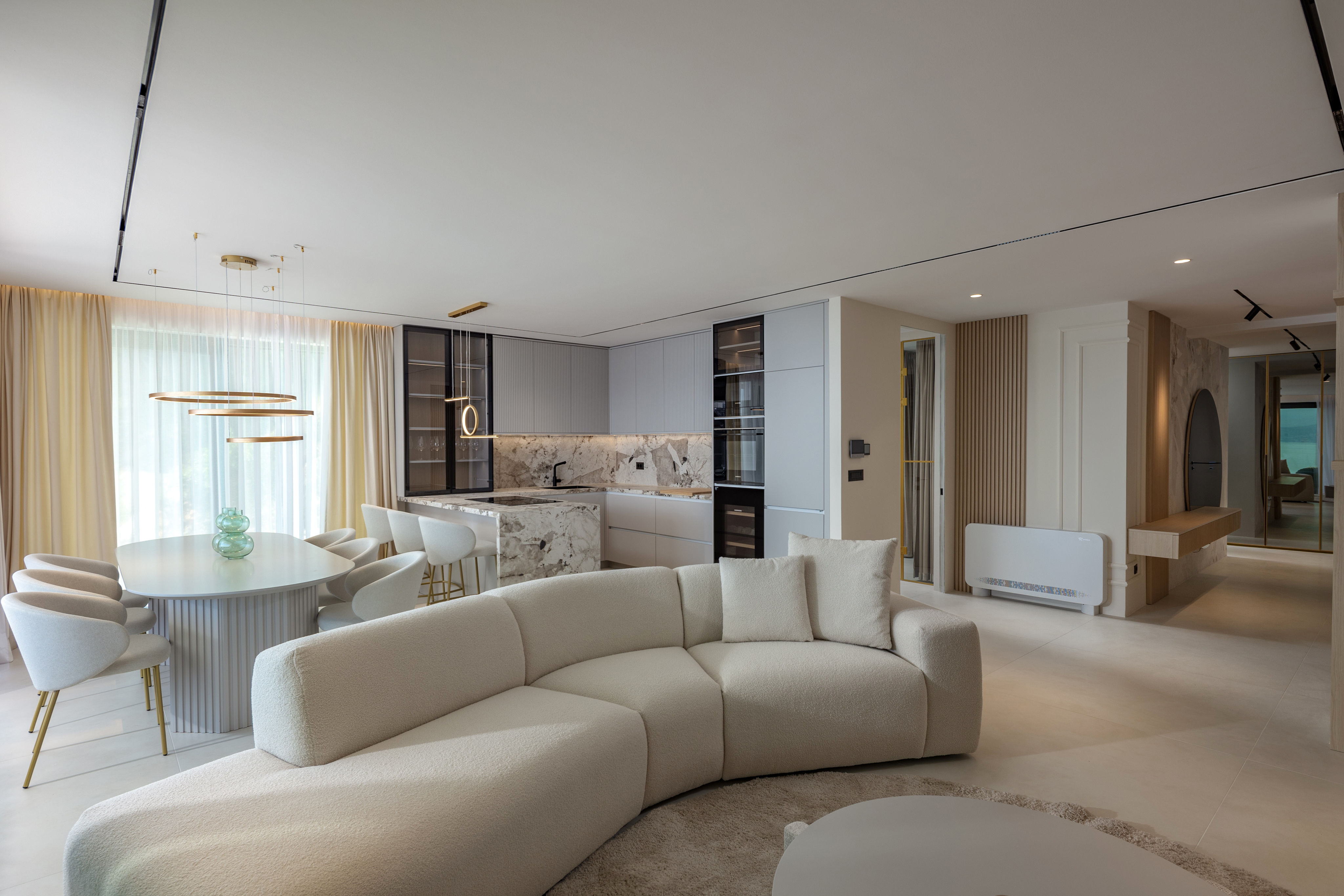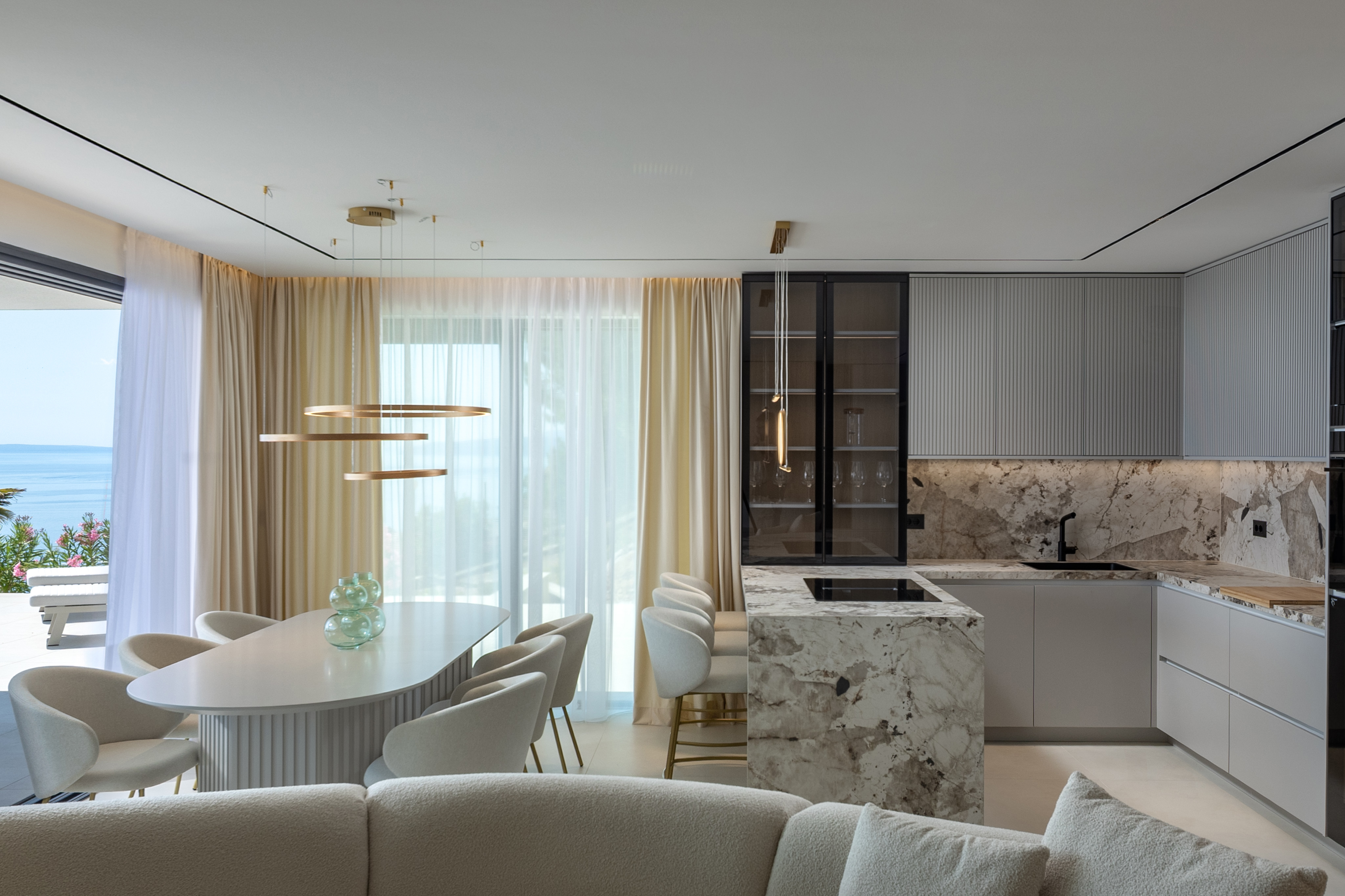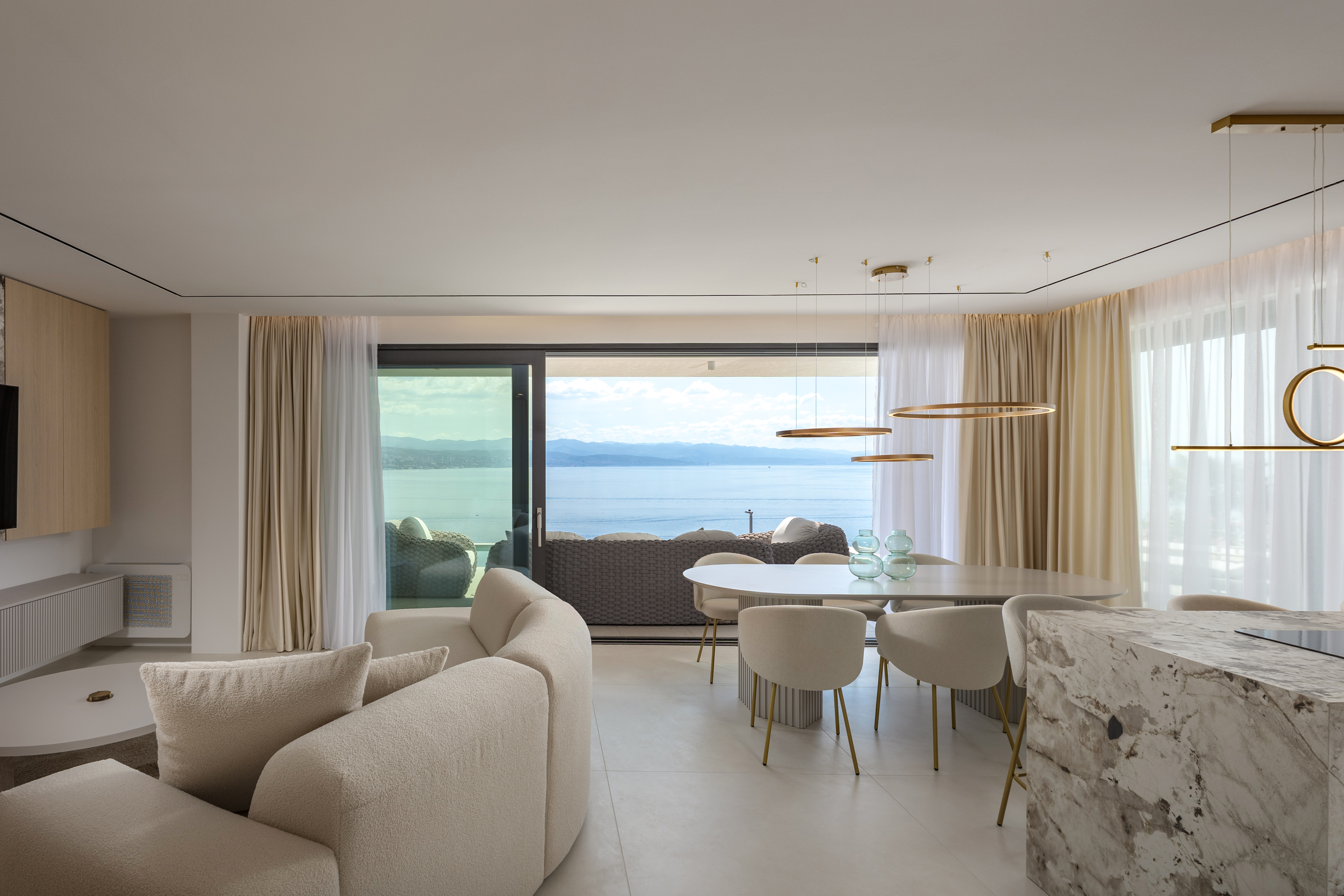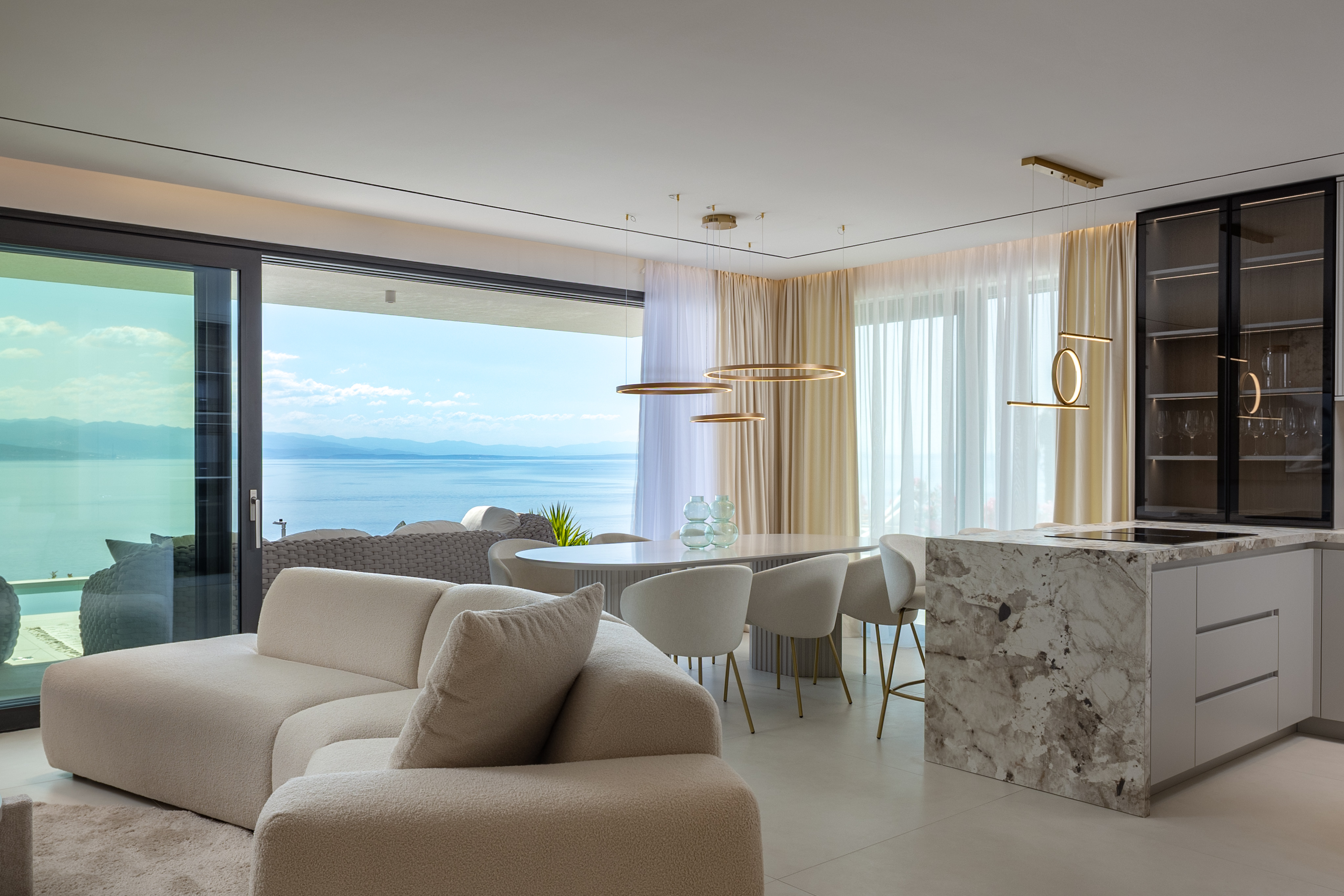 Vista Magica is a bright three-bedroom, three-bathroom apartment where modern comfort meets the Adriatic coast. Expansive windows fill the interiors with natural light, leading to a private terrace with sweeping sea views. A shared swimming pool and landscaped surroundings create a relaxed, resort-style atmosphere.