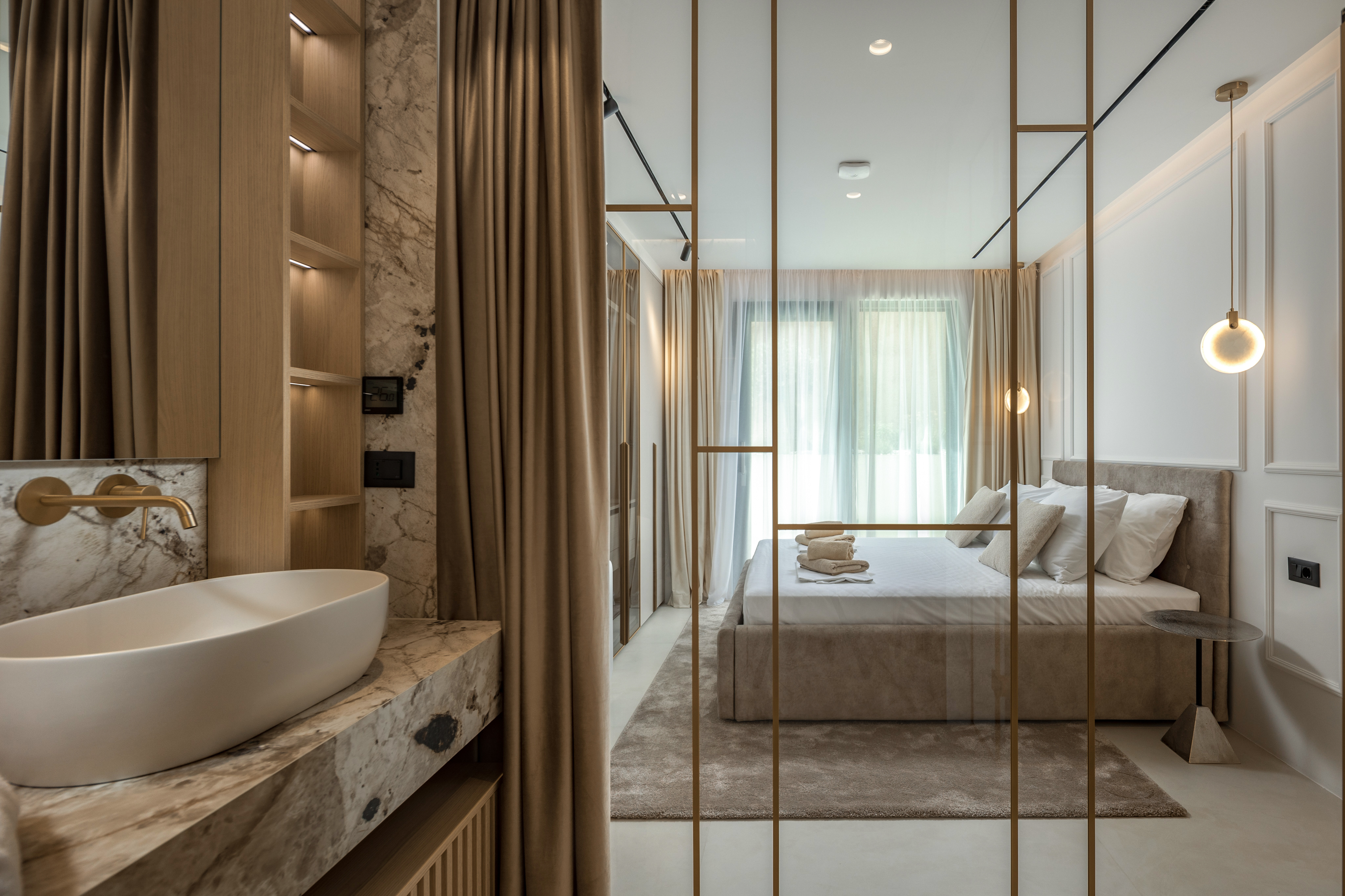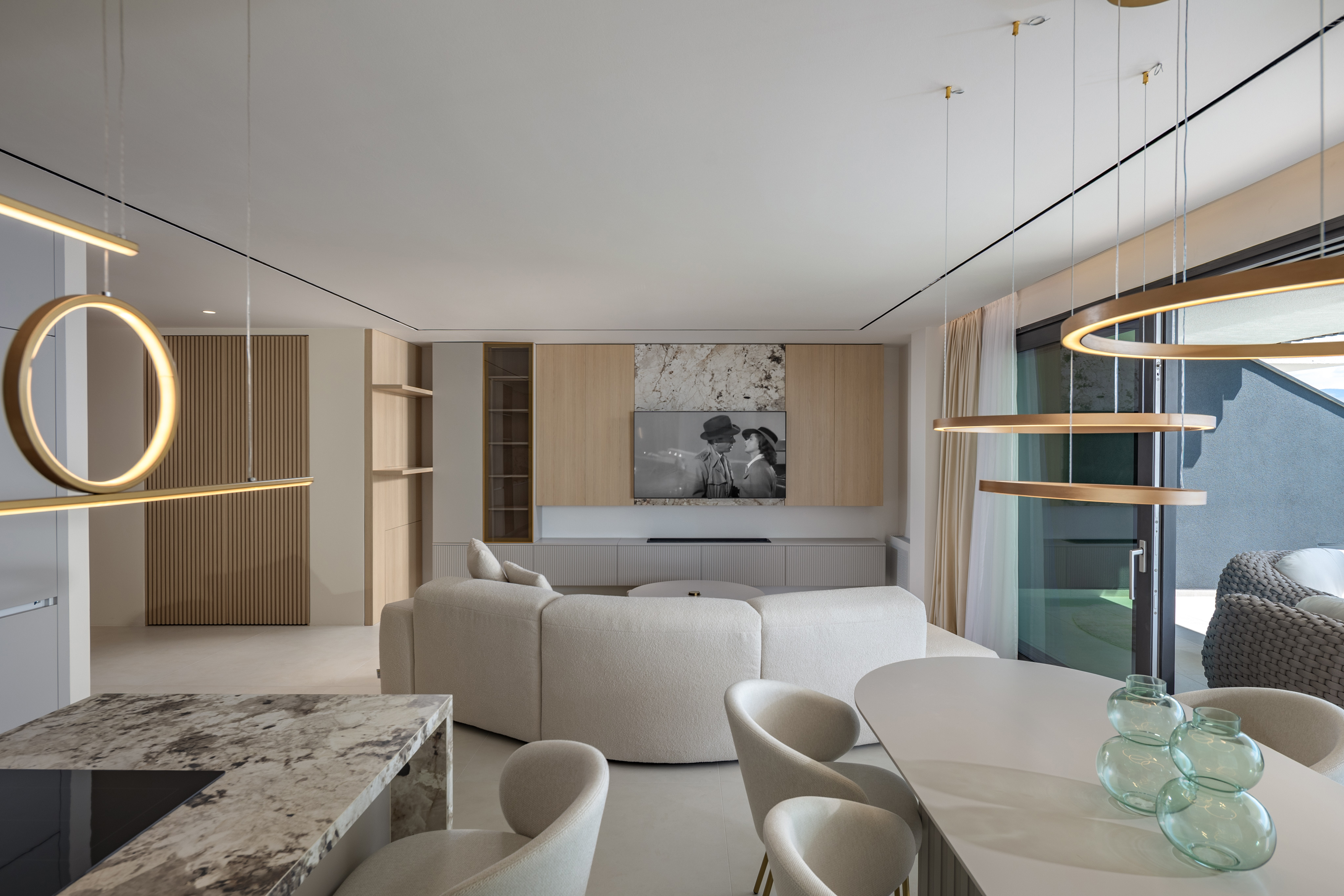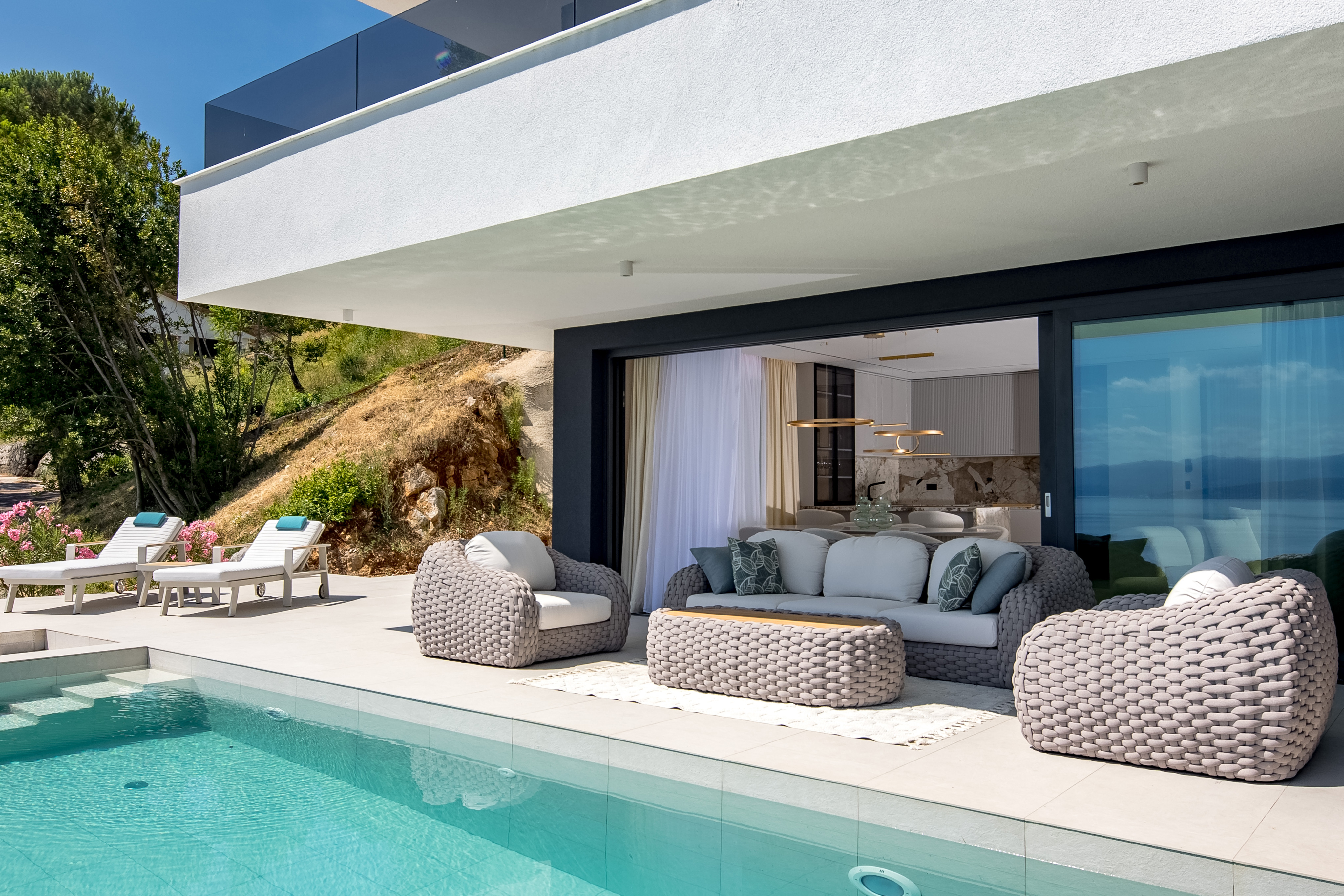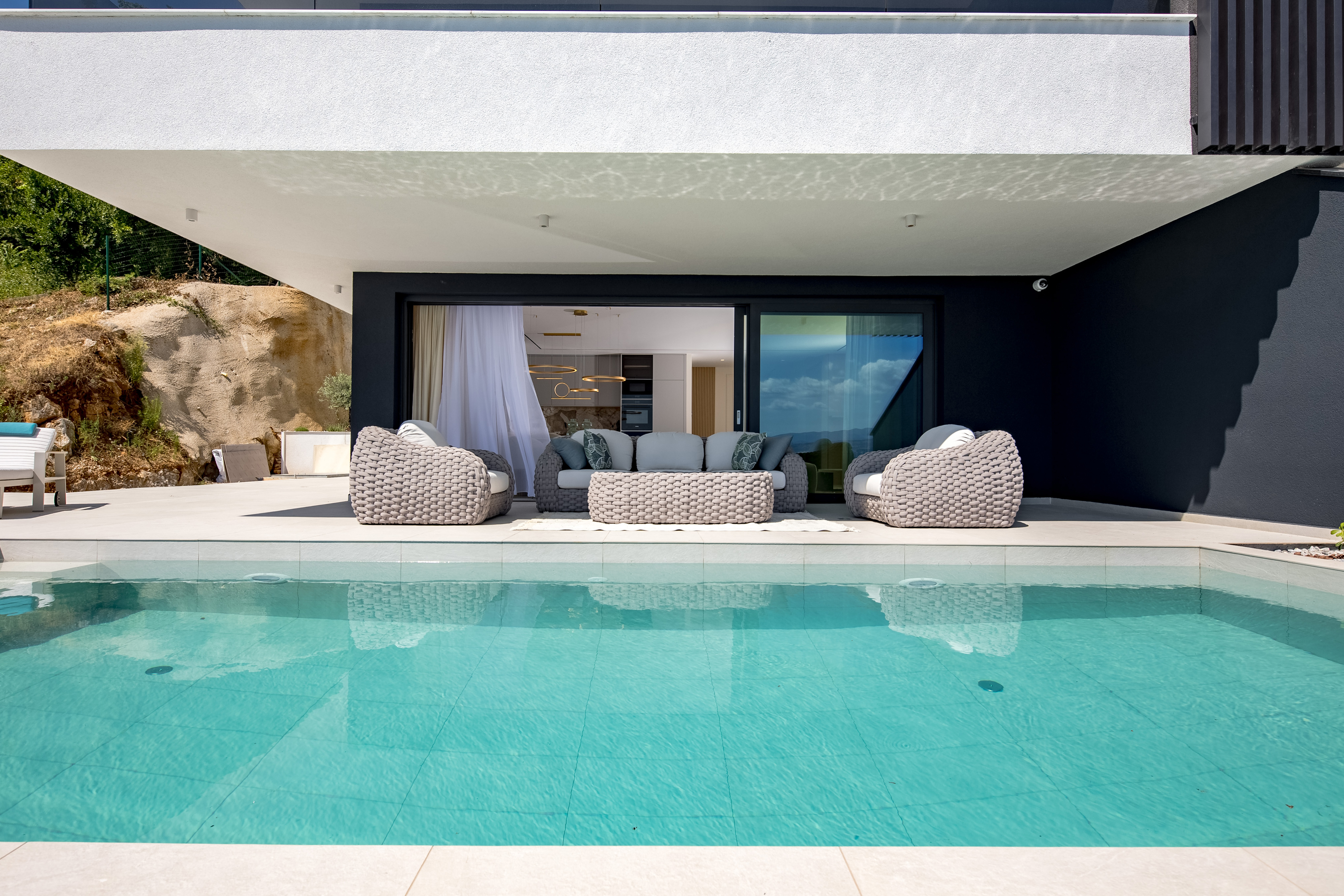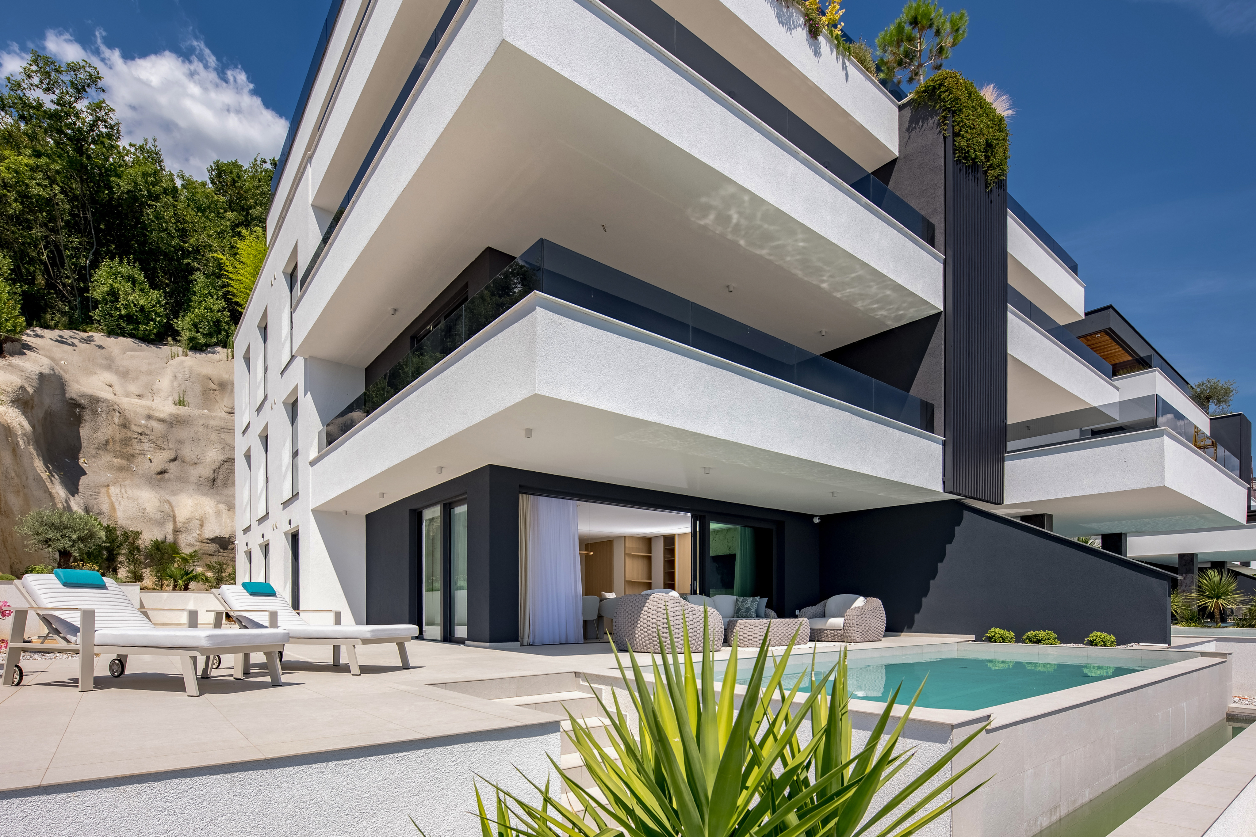 Vista Magica is a bright three-bedroom, three-bathroom apartment where modern comfort meets the Adriatic coast. Expansive windows fill the interiors with natural light, leading to a private terrace with sweeping sea views. A shared swimming pool and landscaped surroundings create a relaxed, resort-style atmosphere.